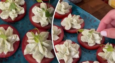 Recept na veľmi chutnú paradajkovú desiatu. Odkaz skopírovaný Rýchly predkrm, ktorý sa stane hviezdou stola / Koláž: My, foto: snímky z videa Paradajky